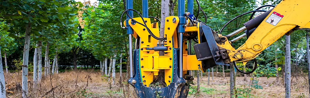 A tree spade is a machine that mechanizes the transplanting of large plants, such as large bushes and small or medium trees. When choosing the right-sized tree spade, you should consider the type of tree, the size of the root ball, digging depth, and if you plan to replant the tree.